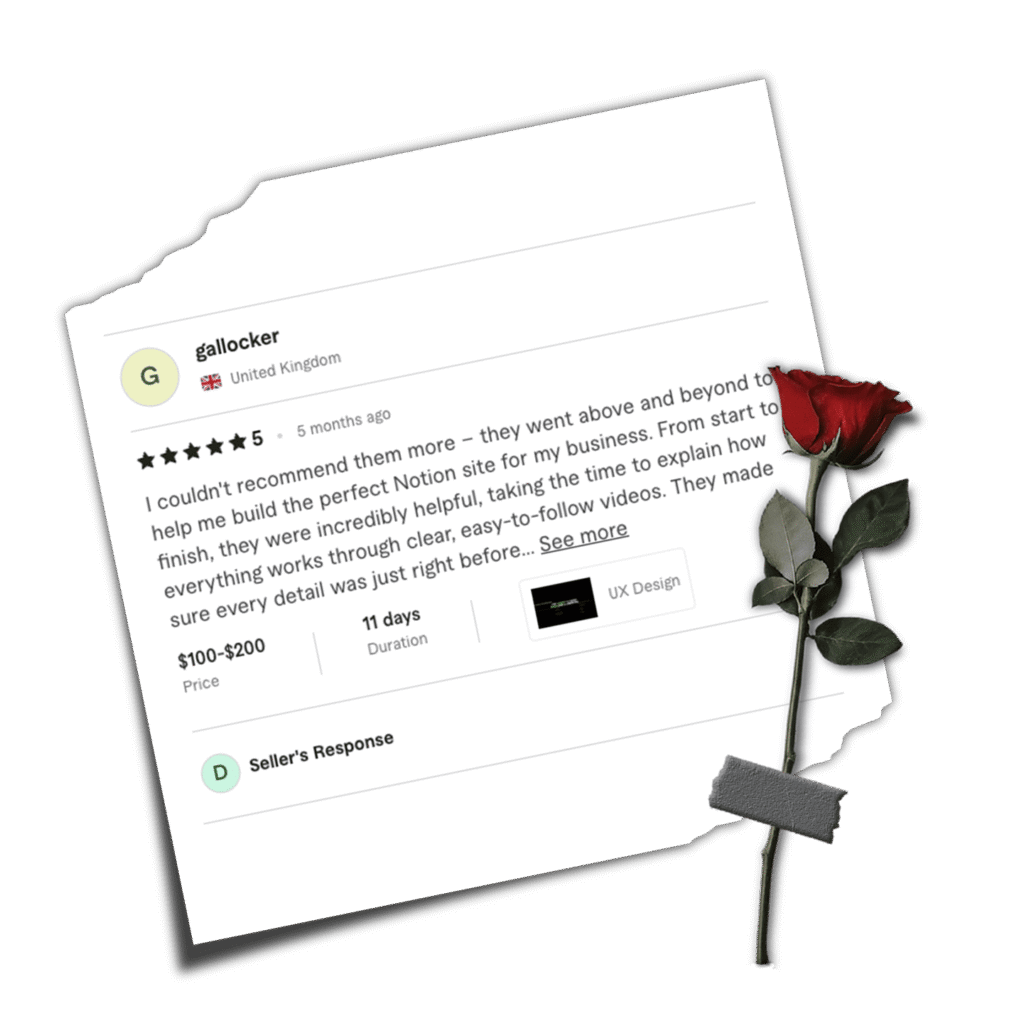 I couldn't recommend them more – they went above and beyond to help me build the perfect Notion site for my business. From start to finish, they were incredibly helpful, taking the time to explain how everything works through clear, easy-to-follow videos. They made sure every detail was just right before wrapping up, and their support and dedication really made the whole experience seamless.